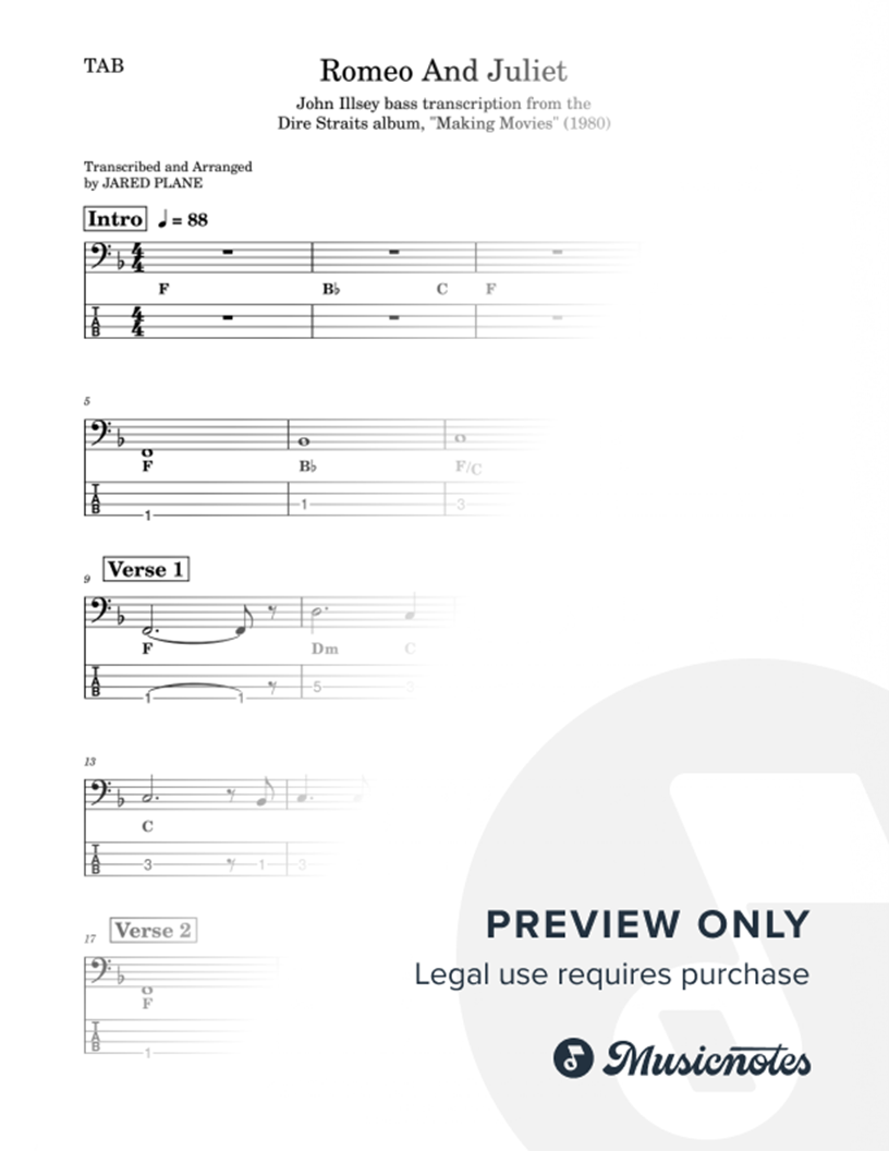 John Illsley's original bass line as played on the Dire Straits song, "Romeo And Juliet" from the 1980 album, "Making Movies". Recommended for intermediate-level bass players and students. This bass transcription comes with Standard Notation, bass TABs and chord symbols.