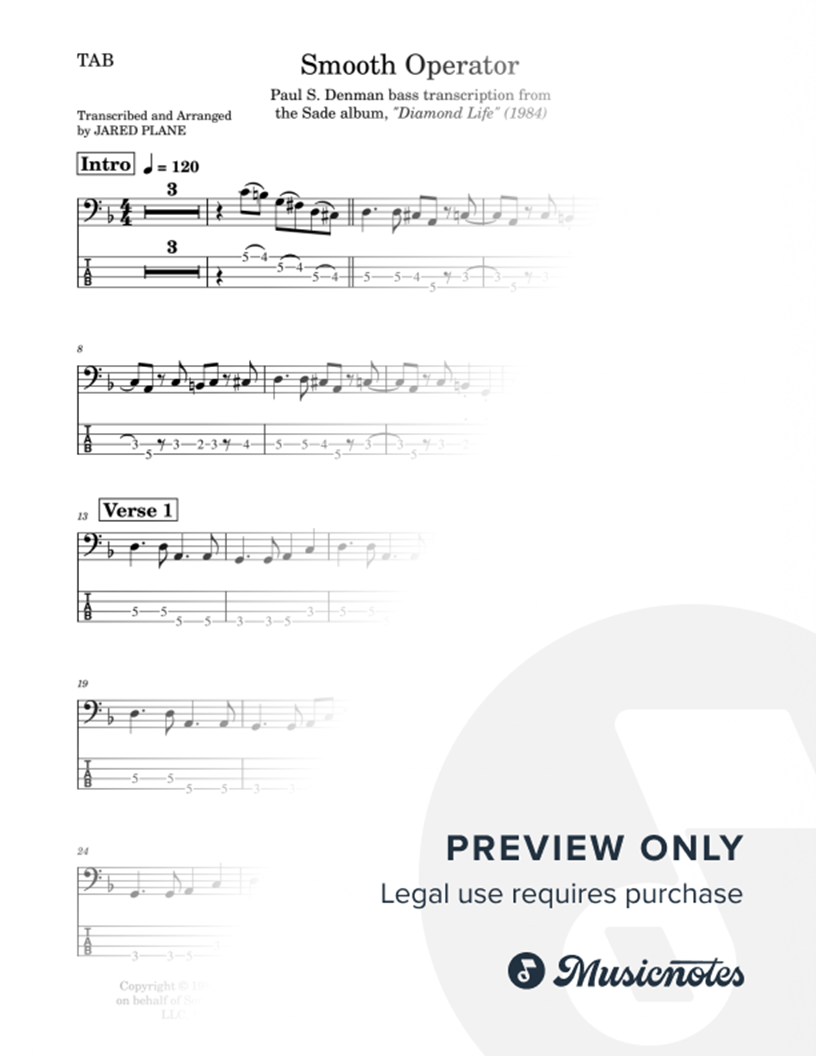 Paul S. Denman's original bass line as played on the Sade classic, "Smooth Operator" released on the 1984 album, "Diamond Life". This bass line serves as a great crossover into Latin- and Bossa Nova-style bass lines, played in a rock context. Denman's iconic bass solo is also fun to play!