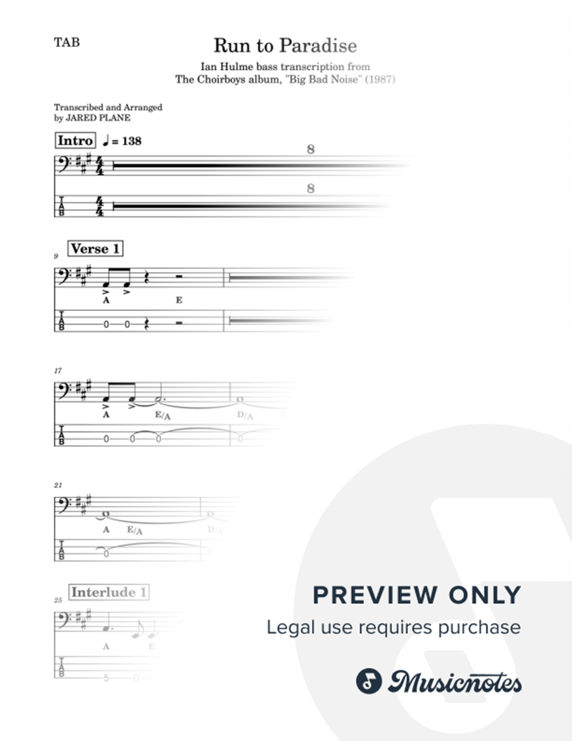 Ian Hulme's original bass line as played on The Choirboys song, "Run to Paradise" from their 1987 album, "Big Bad Noise". Recommended for intermediate-level bass players. This bass transcription comes with Standard Notation, bass TAB and reference chord symbols.