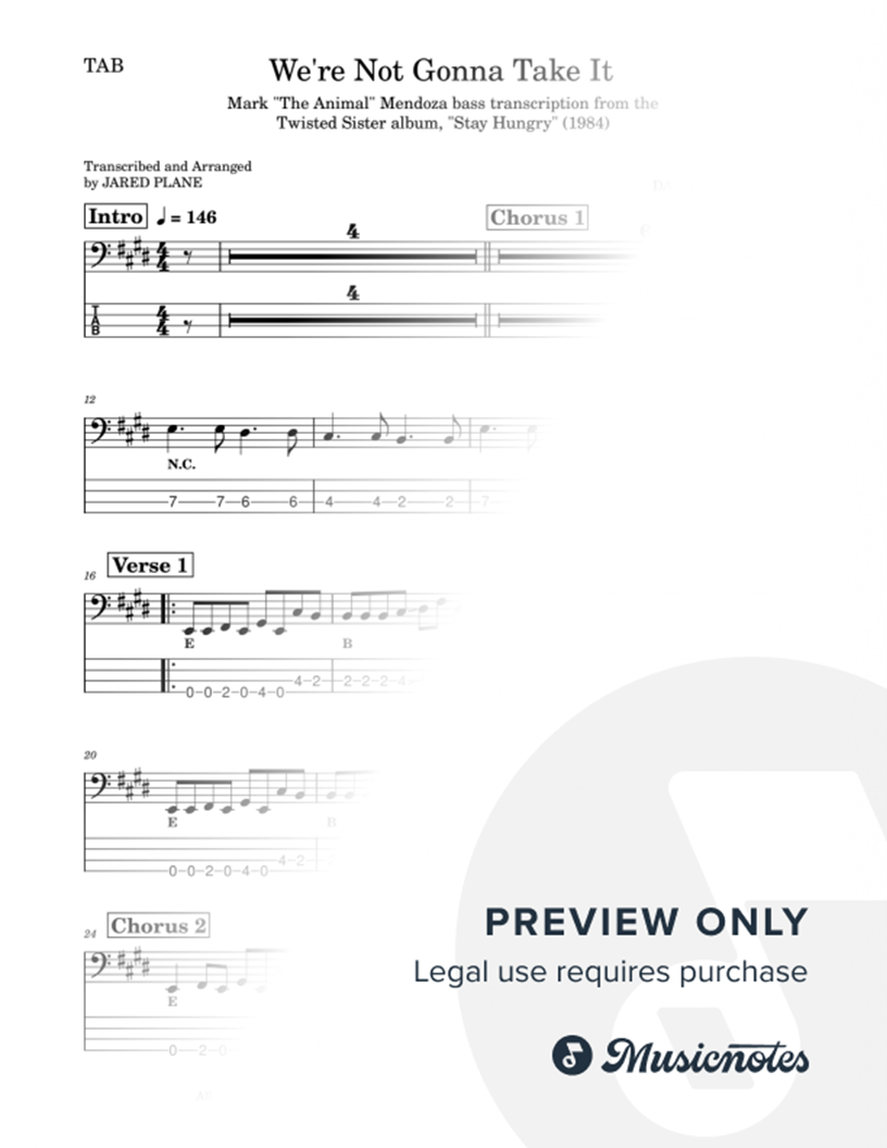 Mark "The Animal" Mendoza's original bass line as played to the Twisted Sister song, "We're Not Gonna Take It" from the 1984 album, "Stay Hungry". This PDF download comes with both Standard Notation, bass TAB and chord symbols.