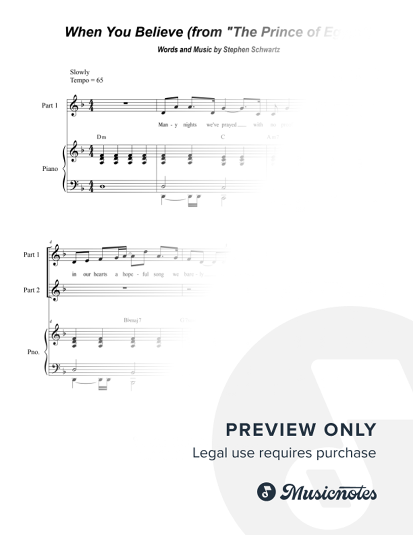 The signature song from the 1998 DreamWorks musical animated feature The Prince of Egypt has now been freshly arranged for a 2-part choir (Part 1: High Voices (Sop. & Ten), Part 2: Low Voices (Alto & Bass) with Piano accompaniment. Price includes a 5-copy limit print license.