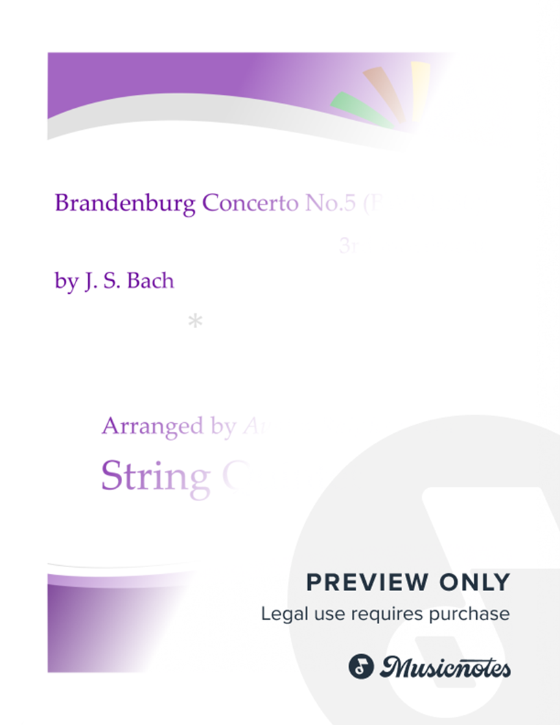 This is a string quintet arrangement of the 3rd movement of Bach’s Brandenburg Concerto No.5. It is a viola quintet, scored for 2 violins, 2 violas and 1 cello. This music has been very carefully arranged is exciting to play for all players. All instruments have the melody at some point.