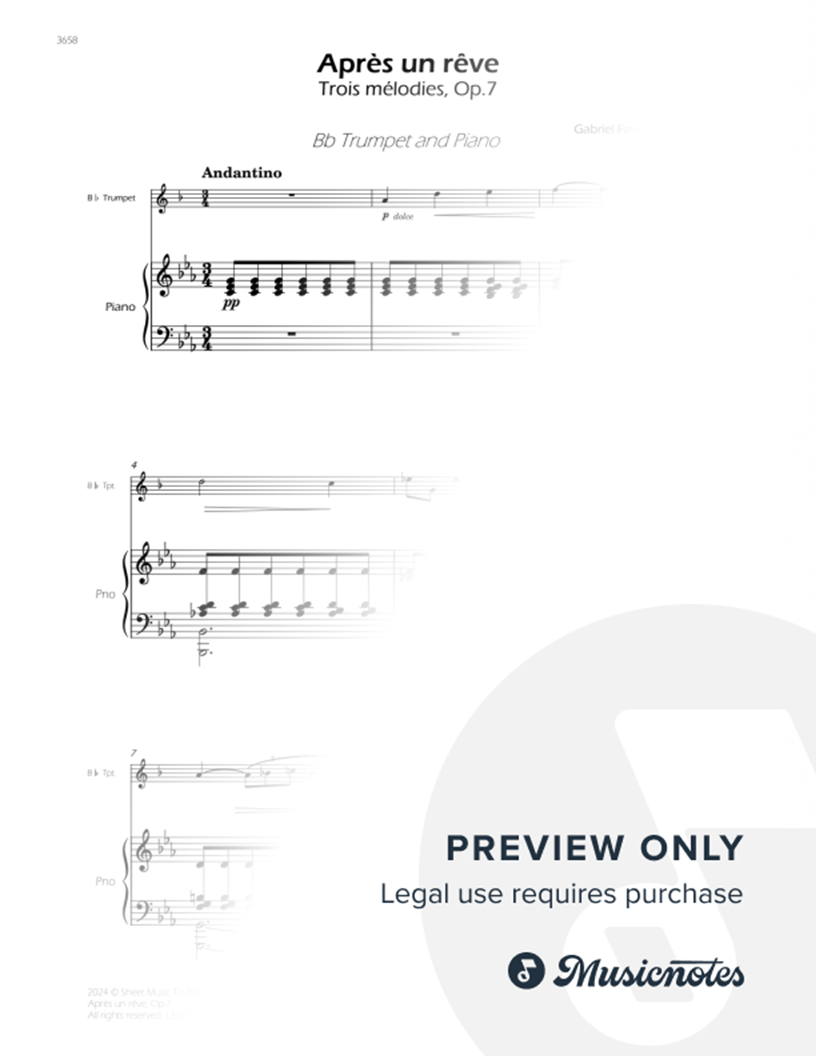 Aprés un rêve, Op.7 by Gabriel Faure. Arrangement for Bb Trumpet and Piano. With Full Score and Individual Parts. Enjoy it!