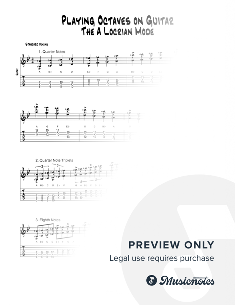 This info sheet shows guitarists how to play a 2-octave A Locrian Mode using octaves (playing two of the same note name, one octave apart, simultaneously). Playing melodies in octaves is a common stylistic choice in jazz & rock music, and is a great way to make lead lines sound bigger and clearer.