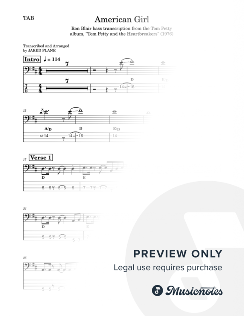 Ron Blair's original bass line as played to the Tom Petty and The Heartbreakers song, "American Girl" from the 1976 album, "Tom Petty and the Heartbreakers". This transcription comes with Standard Notation, bass TABs and chord symbols.