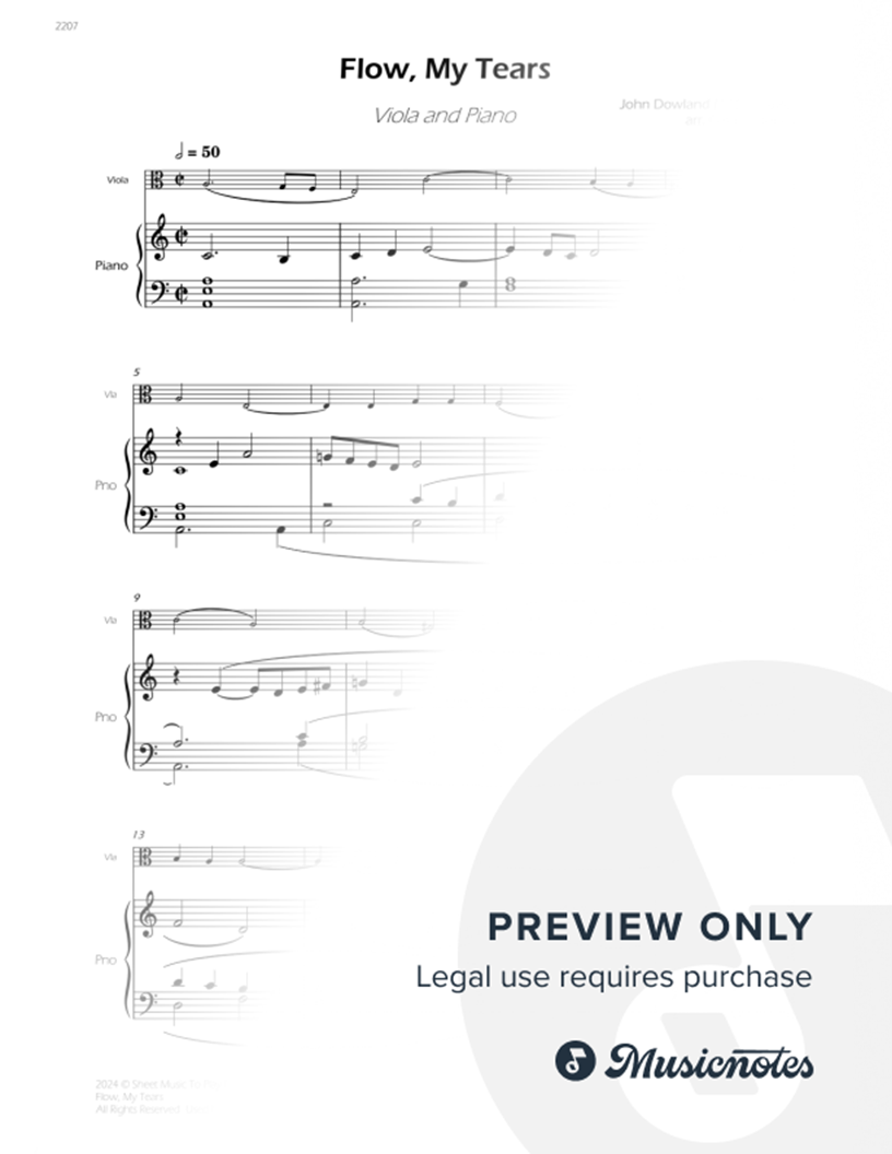 Flow, My Tears by Dowland. Arrangement for Viola and Piano. With Full Score and Individual Parts. Enjoy it!