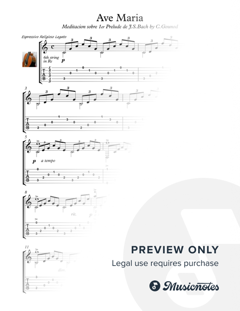 Ave Maria, by Bach/Gounod, is a popular and much-recorded setting of the Latin text Ave Maria, originally published in 1853 as 'Meditation sur le Premier Prelude de Piano de J.S. Bach'. For Classical Guitar solo, with tablature, with finger position suggestions, 2:57 min, three pages.