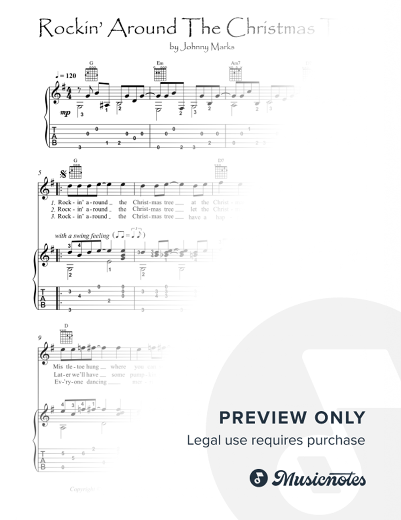 Guitar fingerstyle Solo. Standard notation and tablature. With some fingering position suggestions. With Lyrics. Early Intermediate. Two pages. Christmas song written by Johnny Marks and recorded by Brenda Lee in 1958; it has since been recorded by numerous other music artists.
