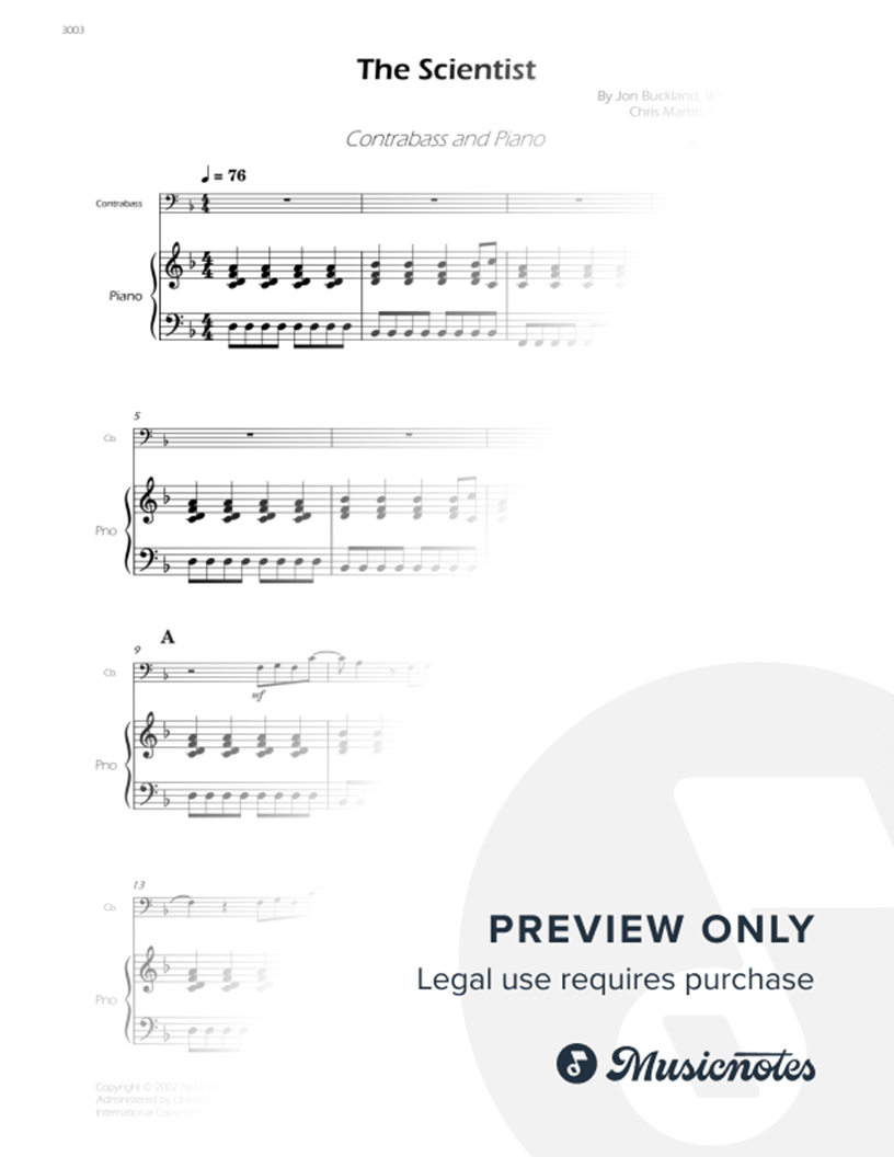 The Scientist by Coldplay. Arrangement for Contrabass and Piano. With Full Score and Individual Parts. Enjoy it!