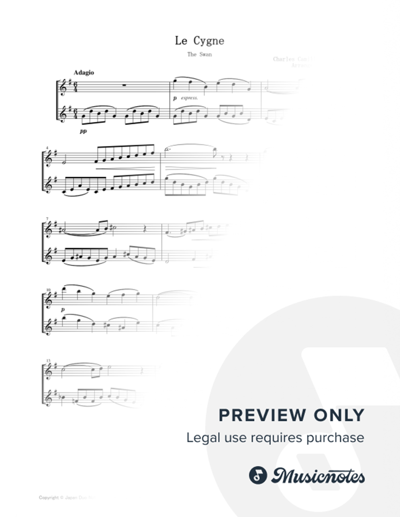 This flute duet version of Le Cygne showcases the beautiful lyrical qualities of the flute, with both parts engaging in expressive and melodic interplay.