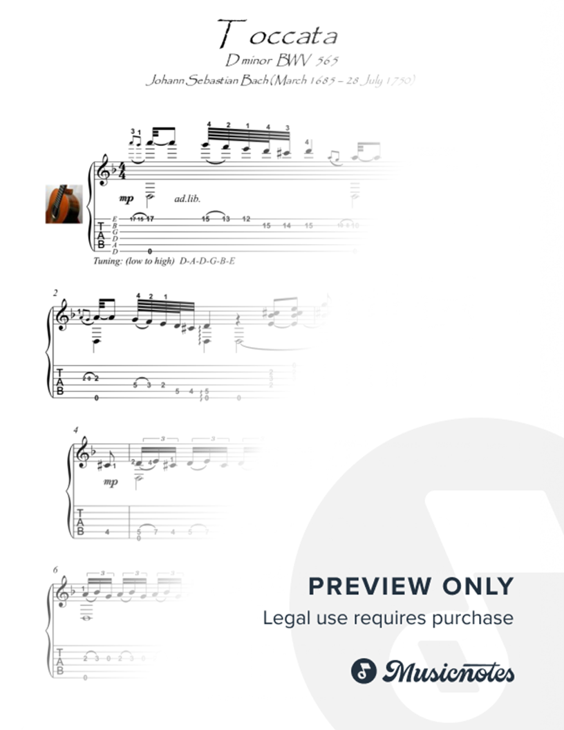 Toccata in D minor, from BWV 565, is a piece of organ music written, by Johann Sebastian Bach. Guitar solo. Guitar in drop D tuning (low E to D). Intermediate. With standard notation and tablature (TAB). Pages: Five (5) pages 2:45 min.