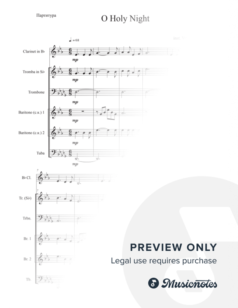 Christmas melody O holy night for wind instruments. Clarinet, Trumpet, Baritone 1 and 2, Trombone, Tuba. Sounds great. Not difficult parties. Christmas notes!