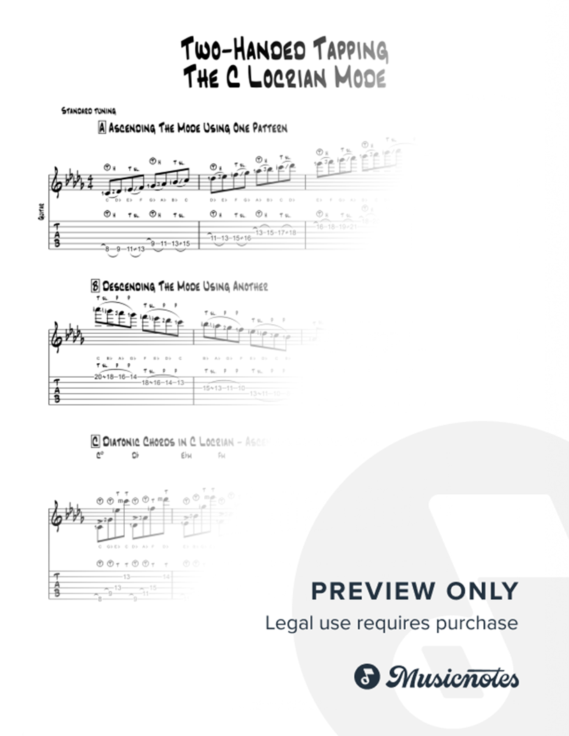 These info sheets teach guitarists how to play the C Locrian Mode using the technique called two handed tapping. 2 ways of playing a 3-octave C Locrian Mode, diatonic chords made from the mode, & a mode/chord connection exercise. A brilliant resource for guitarists looking to learn about tapping.