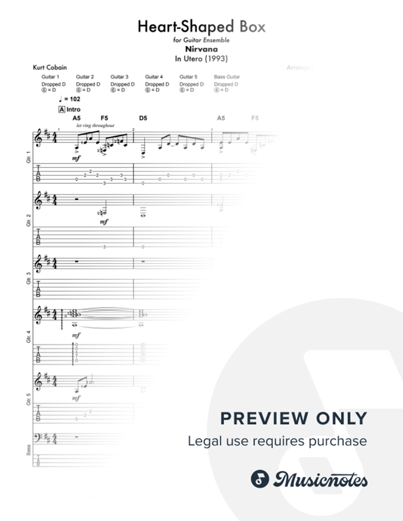 This is a 5 guitar-plus-bass guitar ensemble arrangement of Nirvana's 1993 grunge masterpiece 'Heart-Shaped Box'. In standard notation and TAB. An intense and dynamic arrangement suitable for intermediate level guitarists. An incredible piece to perform for school concerts, recitals and assemblies.