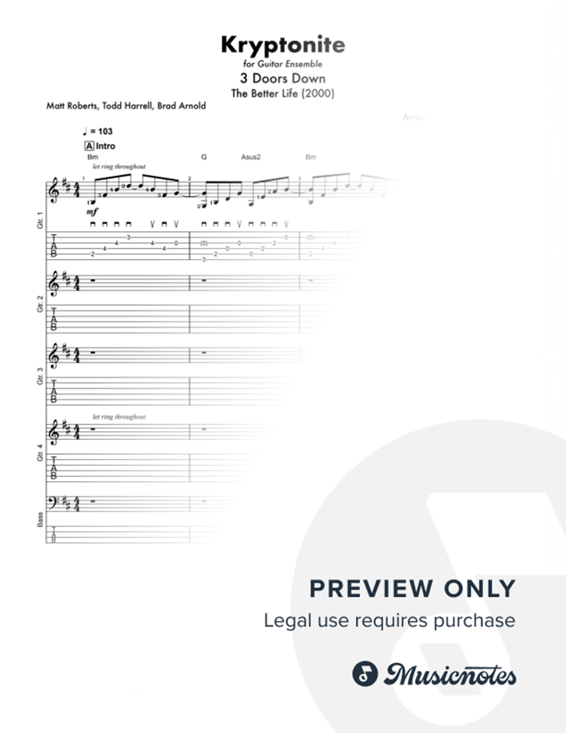 4 guitar-plus-bass guitar ensemble arrangement of 3 Doors Down's 2000 hit song 'Kryptonite'. In standard notation and TAB. An intense and dynamic arrangement suitable for intermediate level guitarists. An incredible piece to perform for school concerts and assemblies. Master score plus all parts.