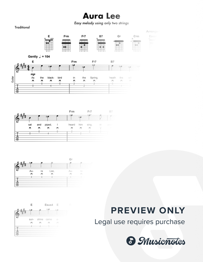 A simple arrangement of Aura Lee aimed at beginner guitarists. The melody is played using only the first 2 strings. Picking and fingering suggestions written in score, with chords and chord diagrams included for teacher accompaniment. A gentle and fun way for beginner guitarists to learn this song.