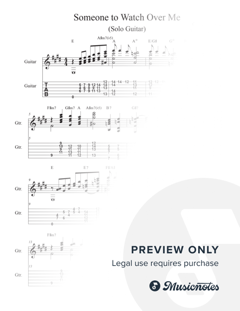 Solo guitar arrangement (chord melody) influenced by Ted Greene for intermediate to advanced level players. This arrangement is one and a half choruses. The A'' section of the first chorus and the B section of a half chorus modulate to the key of C then the A'' section modulate to the key of B.