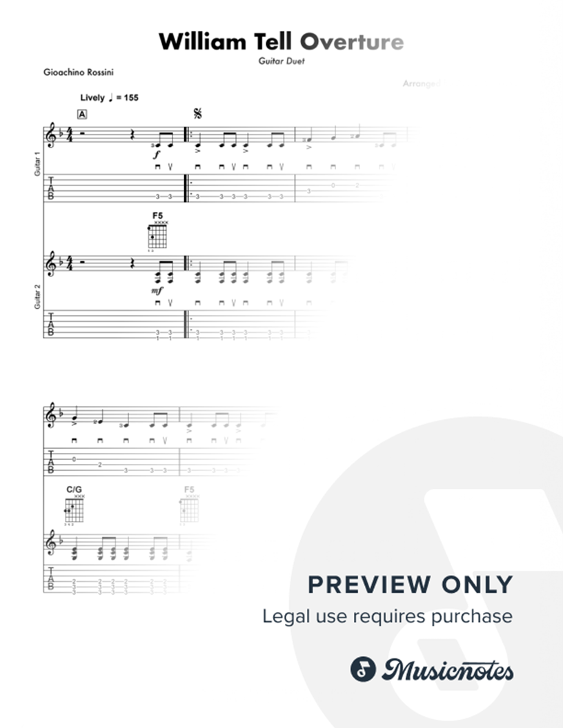 A guitar duet arrangement of Rossini's 'William Tell Overture'. One guitar plays the lead melody, whilst the other plays a chordal accompaniment. This arrangement works on both electric and acoustic guitars, and is a fun and lively reimagining of this famous instrumental. In standard notation & TAB.