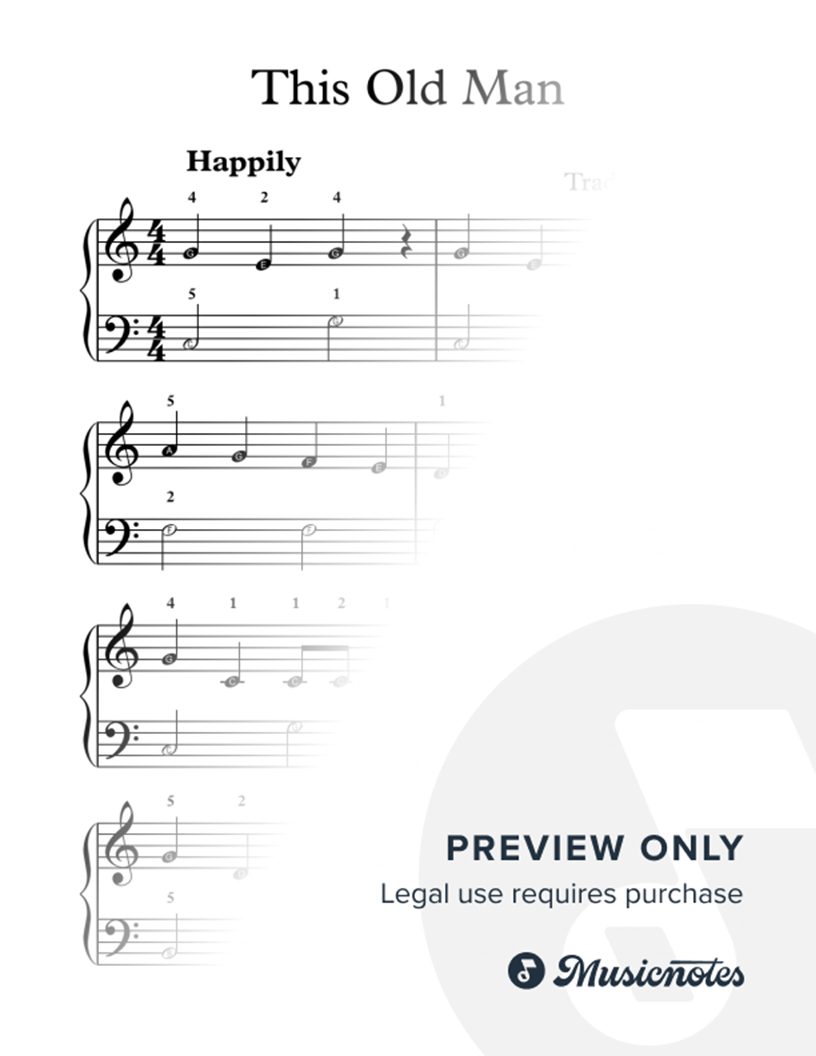 Famous children's song This Old Man in simple piano arrangement for kids. Wide staff and labeled notes with fingerings.