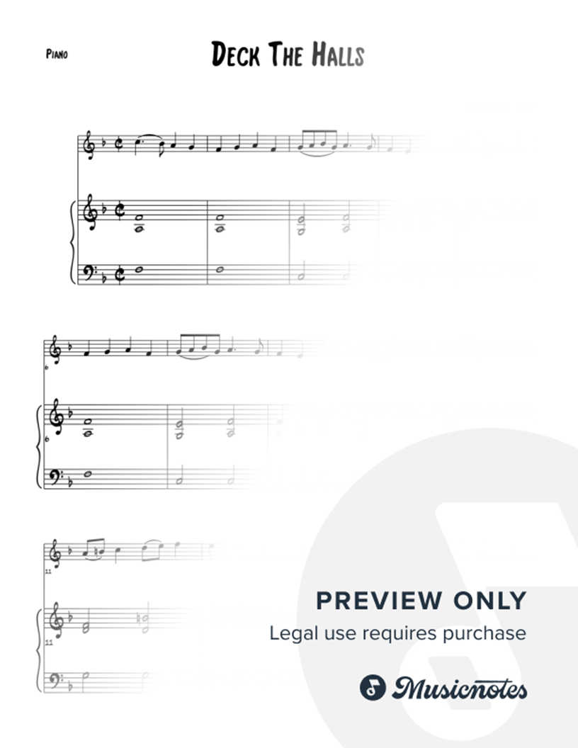 Christmas song Deck the Halls in easy arrangement for flute with piano accompaniment. F major. Separate flute and piano parts.