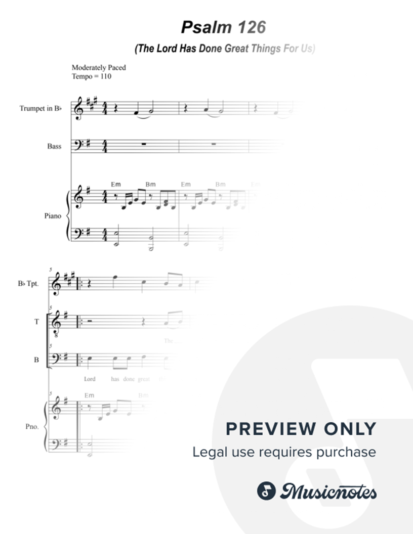 Energetic hymn based on Psalm 126 "The Lord Has Done Great Things For Us" which can be used for many times throughout the liturgical year. Scored for a 2-part choir (TB), Bb Trumpet and Piano. Price includes a 5-copy limit print license.