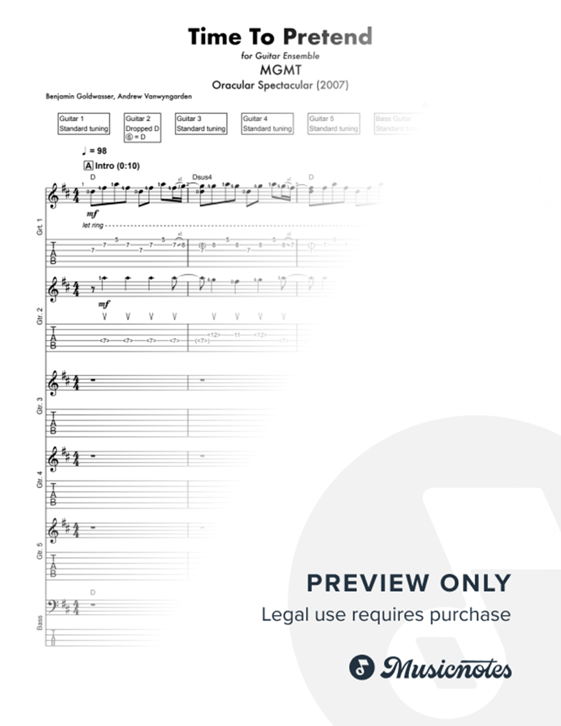 This is a 5 guitar-plus-bass guitar ensemble arrangement of MGMT's 2008 hit song 'Time To Pretend'. In standard notation and TAB. A melodic and layered arrangement suitable for intermediate to advanced level guitarists. A brilliant piece to perform for concerts and assemblies. Full score plus parts.