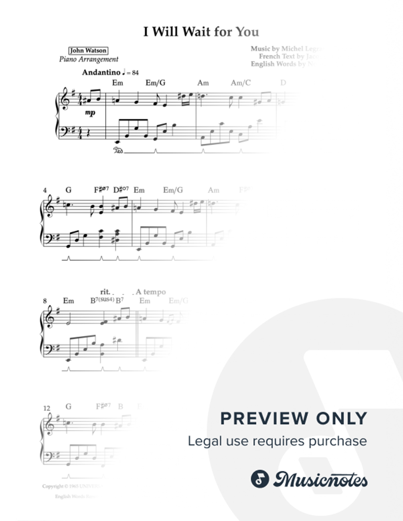 © 1965 UNIVERSAL-SONGS OF POLYGRAM INTERNATIONAL, INC., JONWARE MUSIC CO., LES PRODUCTIONS FRANCIS LEMARQUE, LES PRODUCTIONS MICHEL LEGRAND and NEW THUNDER MUSIC CO. English Words Renewed by NORMAN GIMBEL and Assigned to GIMBEL MUSIC GROUP, INC. (P. O. Box 15221, Beverly Hills, CA 90209 USA) All Rights Reserved Used by Permission |