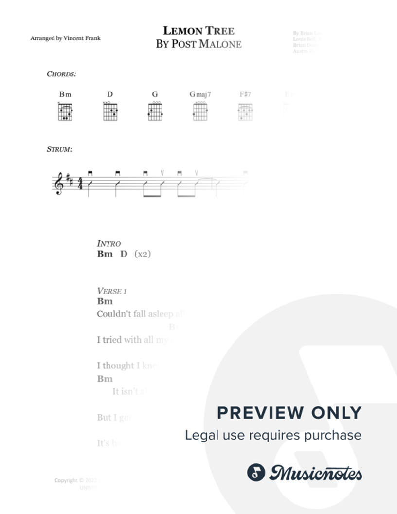 Chord sheet arrangement of Post Malone's "Lemon Tree". Includes fretboard diagrams, chord symbols, strum pattern, and lyrics. Original key of Bm, 4 pages.
