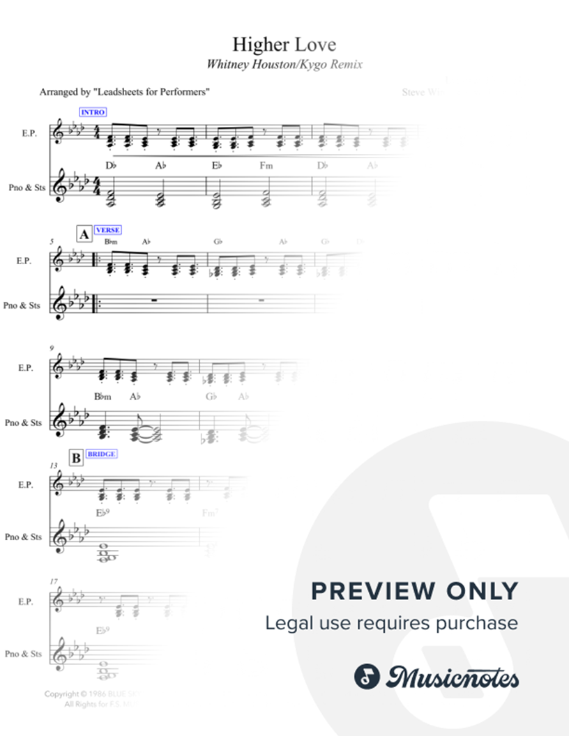 This is a Leadsheet score for Whitney Houston's and Kygo's version of Steve Winwood's and Will Jennings' song "Higher Love". THIS IS --NOT-- THE ORIGINAL SONG. This is the remix done by Kygo in 2019. This was notated in full, according to the original recording and in the original key.