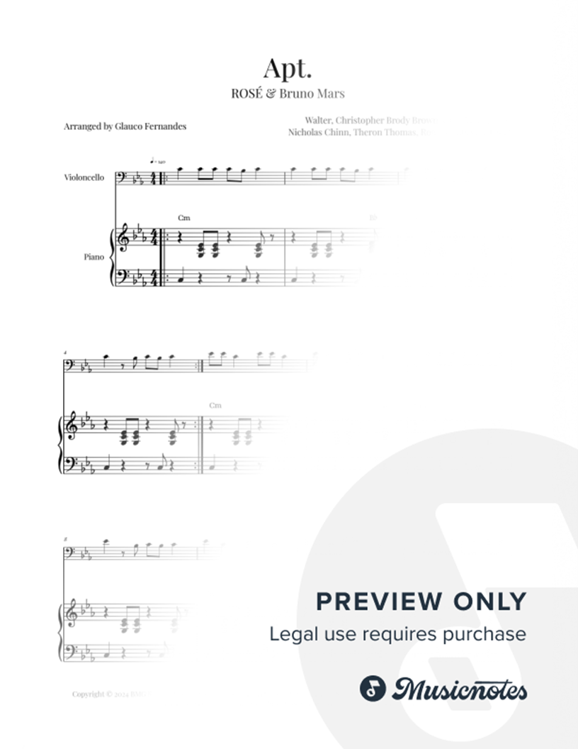 Sheet music for "Apt." by ROSÉ and Bruno Mars, arranged for cello and piano. Perfect for recitals and performances. Clear notation and a unique arrangement. Download now and enjoy playing this beautiful piece!