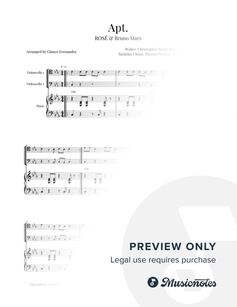 Sheet music for APT. by ROSÉ and Bruno Mars, arranged for CELLO DUET & PIANO with chord symbols. Perfect for recitals and performances. Clear notation and a stunning arrangement. Download now and enjoy it!