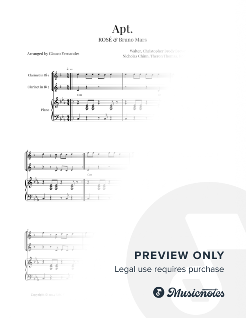 Sheet music for APT. by ROSÉ and Bruno Mars, arranged for CLARINET DUET with PIANO and chord symbols. Perfect for recitals and performances. Clear notation and a beautiful arrangement. Download now!
