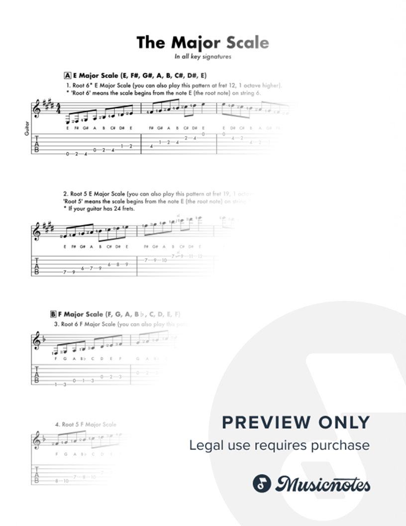 This 8-page resource teaches guitarists how to play the major scale in every key signature. Each section teaches how to play both a root 6 and root 5 scale pattern for each key signature. In standard notation and TAB, with note names and fingering included in score for ease of learning.