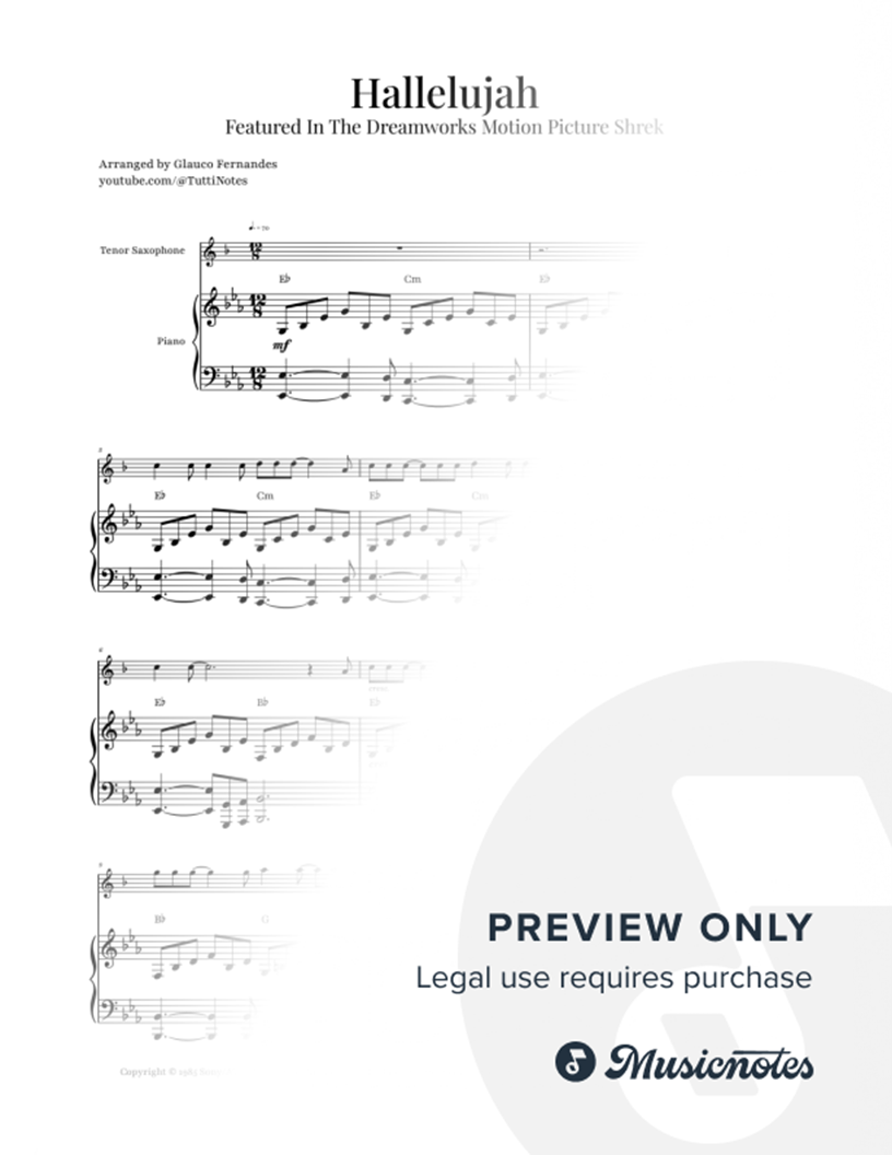 Sheet music for Hallelujah by Leonard Cohen, featured in Shrek, arranged for TENOR SAX & PIANO with chord symbols. Perfect for recitals and performances. Purchase now!