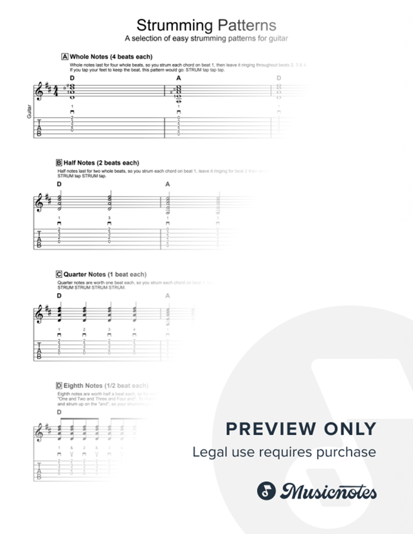 This resource teaches beginner guitarists how to play a number of easy and common strumming patterns using whole notes, half notes, quarter notes and eighth notes. It explains how to count each kind of note and strumming pattern. In standard notation and TAB. Suitable for beginner guitarists.