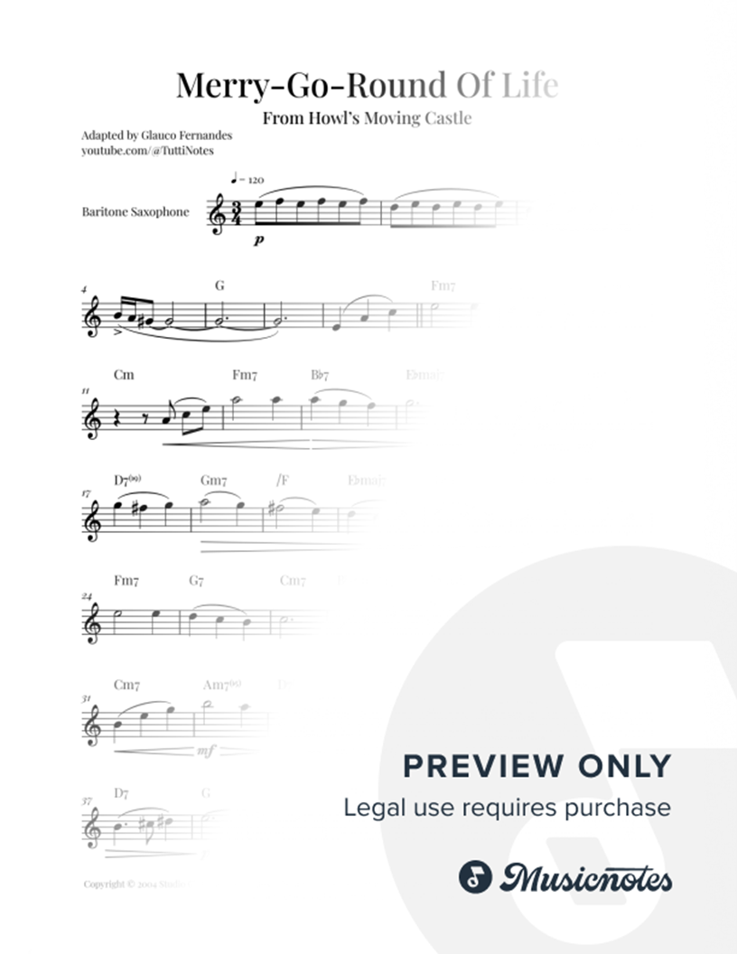 Sheet music for Merry-Go-Round of Life by Joe Hisaishi, the iconic theme from Howl's Moving Castle, arranged for BARITONE SAX SOLO with chord symbols. Perfect for recitals. Purchase now!