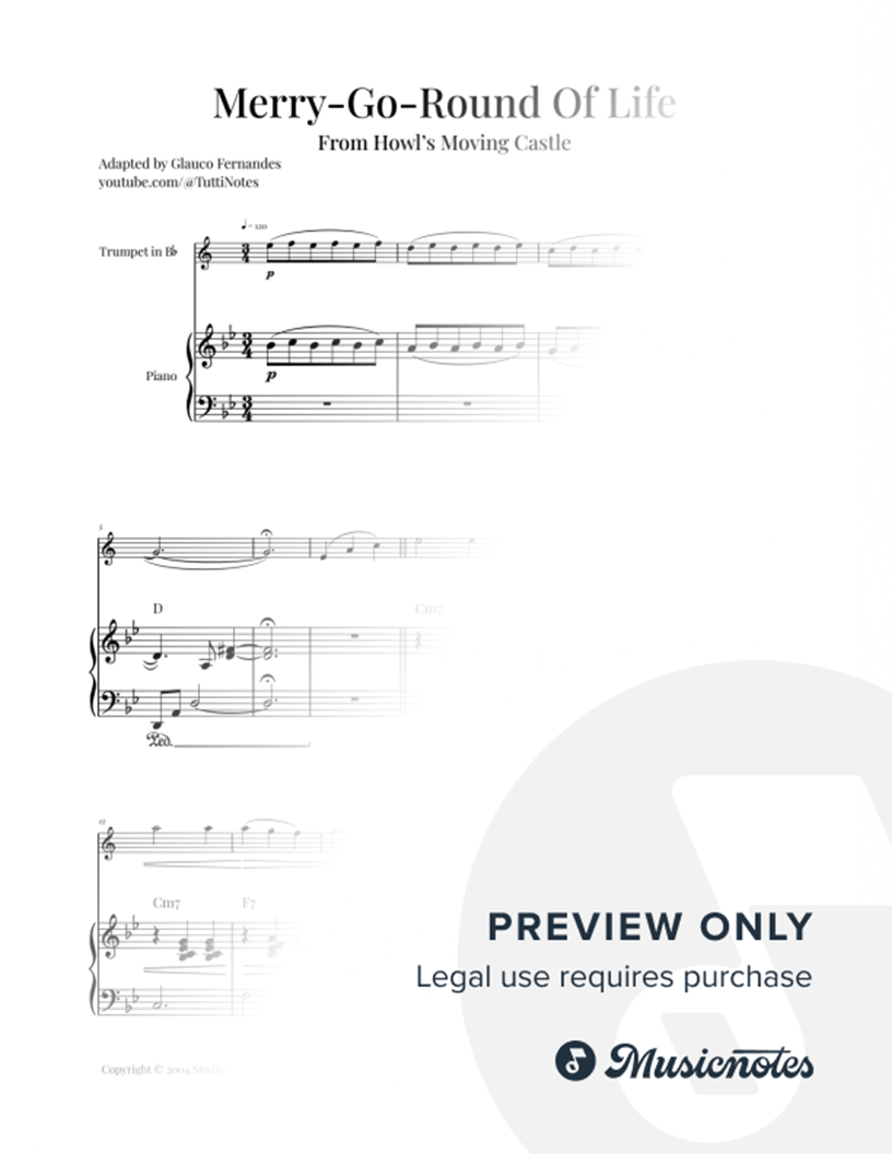 Sheet music for Merry-Go-Round of Life by Joe Hisaishi, the iconic theme from Howl's Moving Castle, arranged for TRUMPET & PIANO with chord symbols. Perfect for recitals and performances. Purchase now!