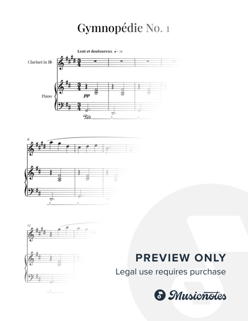 Sheet music for Gymnopédie No. 1 by Erik Satie, the timeless impressionist masterpiece, arranged for CLARINET & PIANO. Perfect for recitals and performances. Clear notation and a serene arrangement. Purchase now!