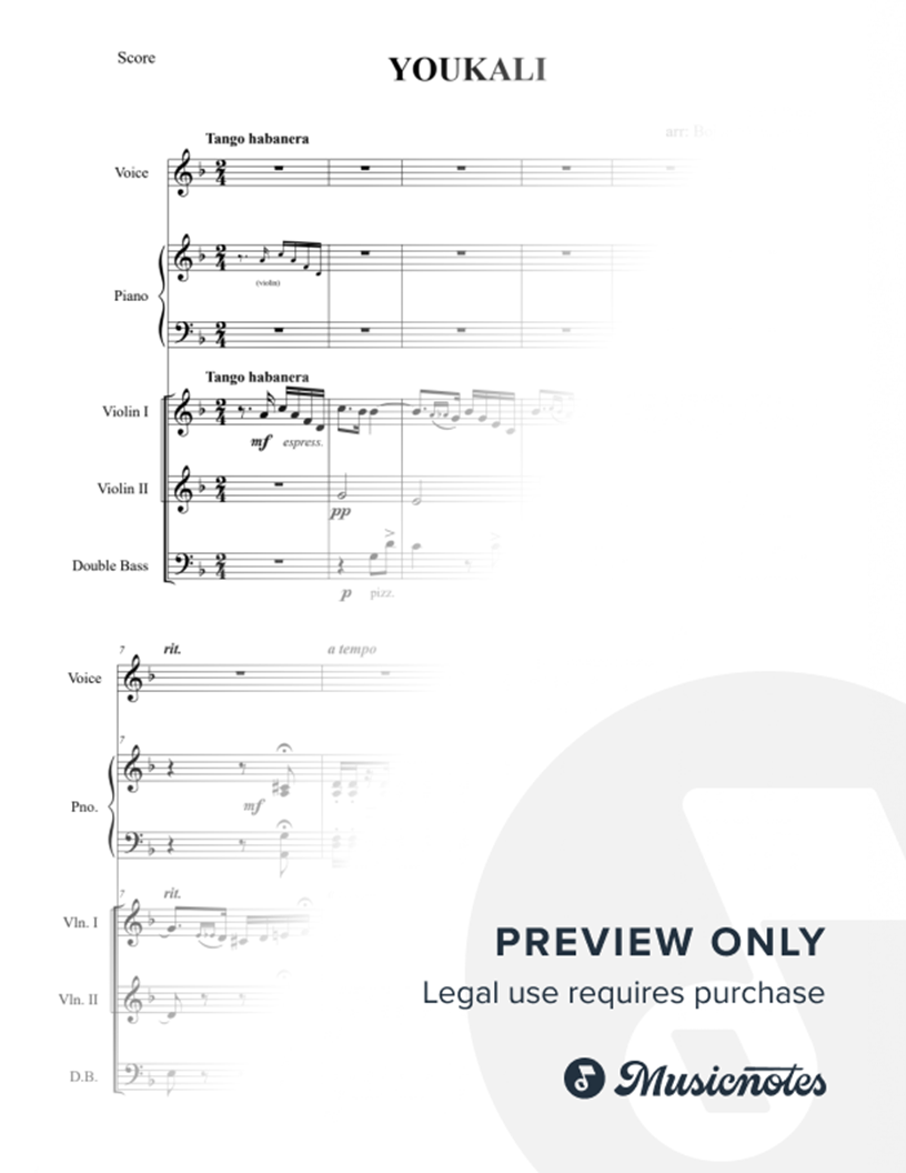 Arrangement for voice, two violins, piano & doublebass by Bojan Mladenovic - Score & Parts in PDF file