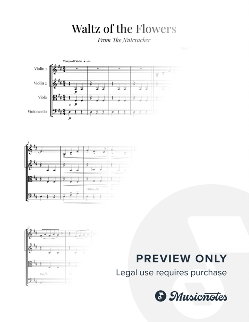 Tchaikovsky's "Waltz of the Flowers" - STRING QUARTET. Captivating arrangement for strings, highlighting rich textures and nuances. Chords included for study and performance. Ideal for ensembles and classical music enthusiasts.