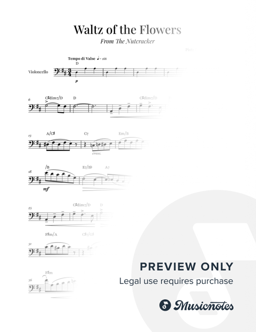 Sheet music for Waltz of the Flowers by Tchaikovsky, arranged for CELLO with CHORD SYMBOLS. Perfect for soloists with accompaniment. Clear notation, no repeats, optimized for digital reading. Ideal for performances. Purchase now!