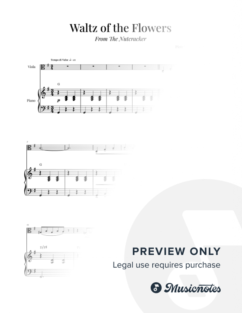 Sheet music for Waltz of the Flowers by Tchaikovsky, arranged for VIOLA & PIANO with CHORD SYMBOLS. Perfect for duets. Clear notation, no repeats, optimized for digital reading. Ideal for performances. Purchase now!