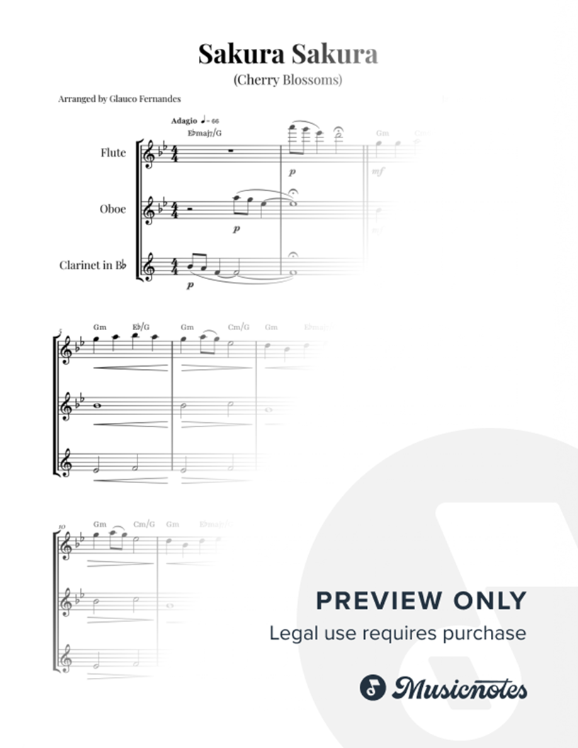Sheet music for Sakura Sakura arranged for Woodwind Trio (Flute, Oboe, Clarinet). Includes score and individual parts. No repeat signs, optimized for digital reading. Clear notation. Perfect for performances. Purchase now!