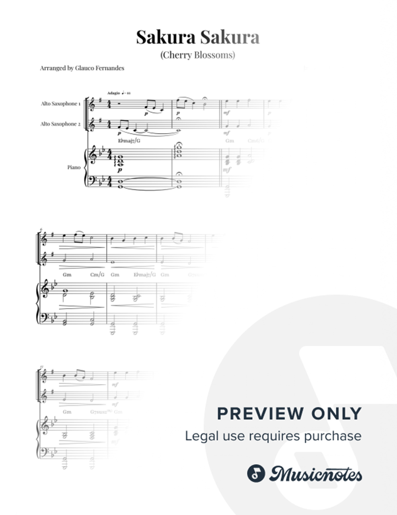 Sheet music for Sakura Sakura arranged for Alto Sax Duet and Piano. Includes score and individual parts. Professional layout. Clear notation. Perfect for performances. Purchase now!