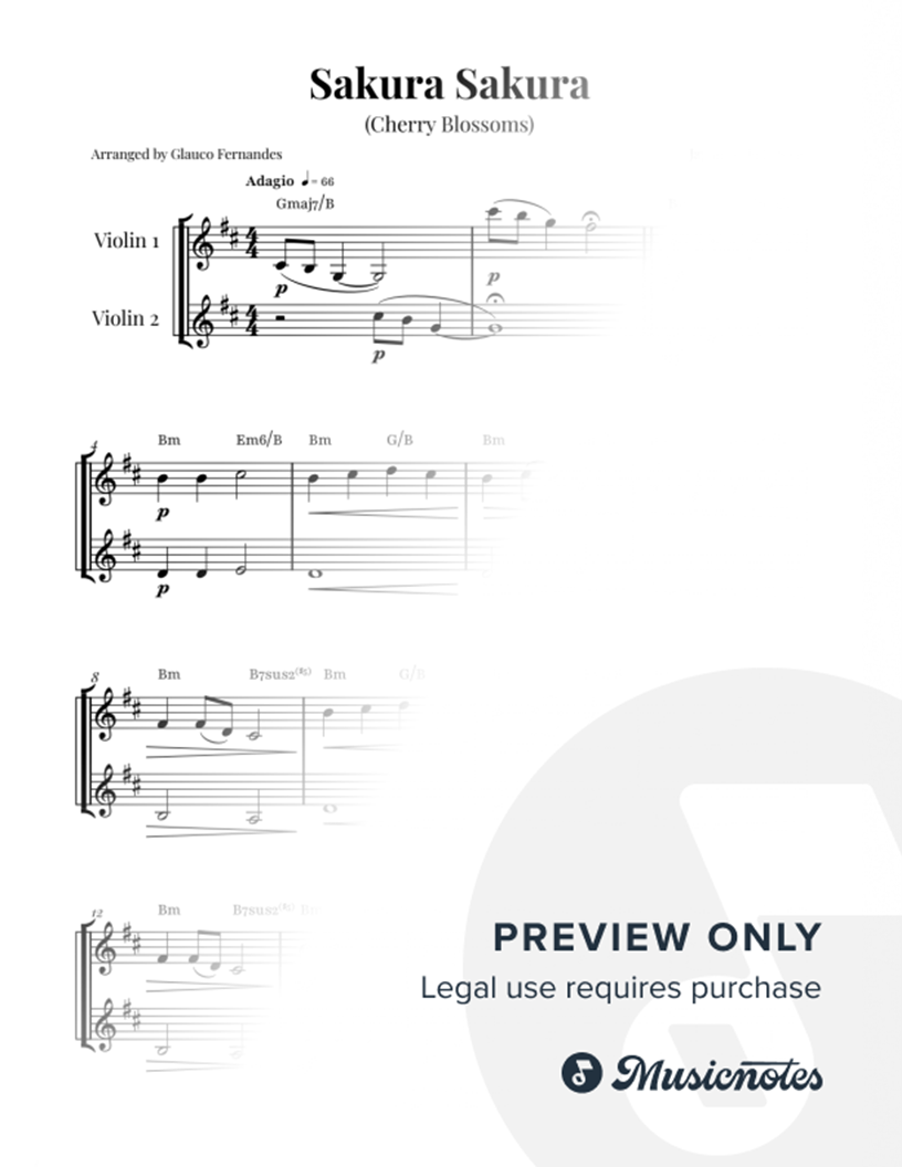Sheet music for Sakura Sakura arranged for Violin Duet. Includes score and individual parts. Professional layout. Clear notation. Perfect for performances. Purchase now!