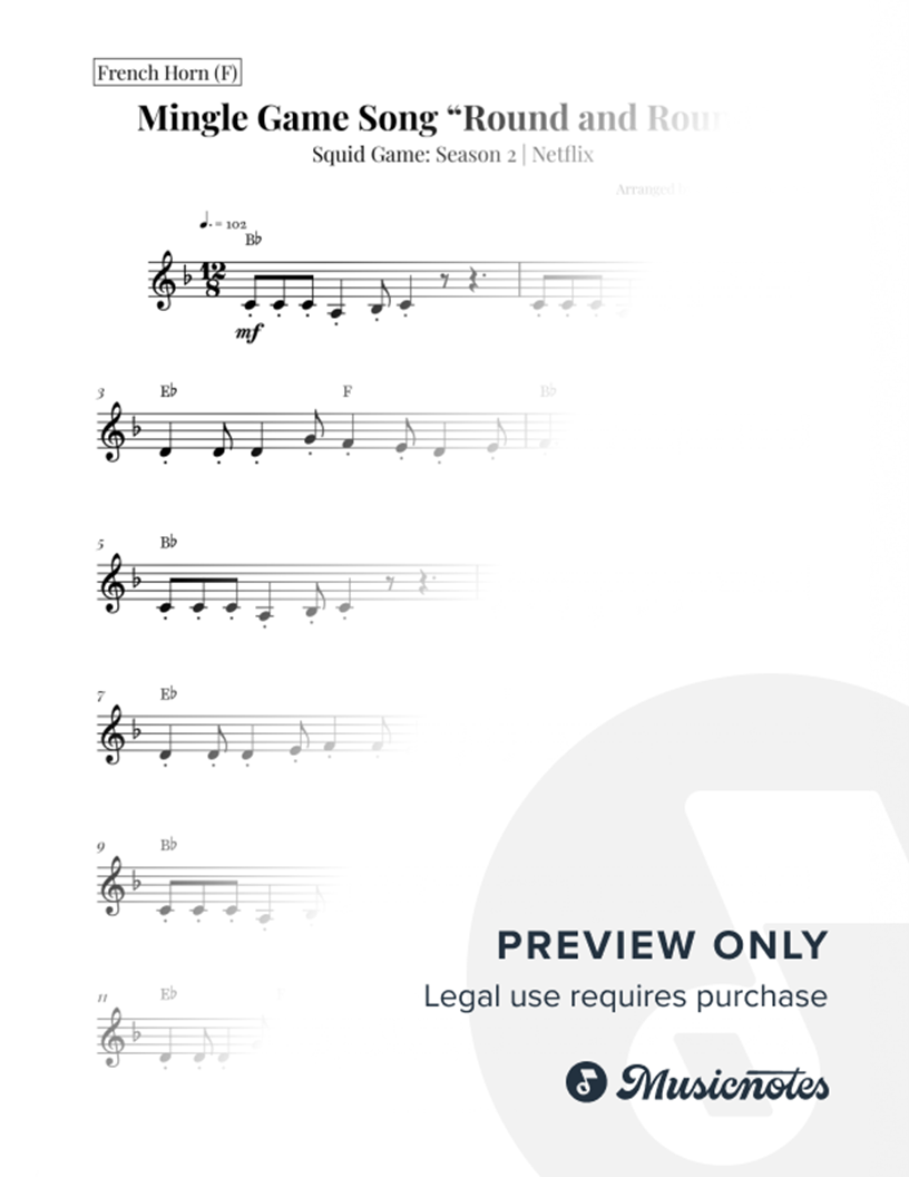Sheet music for Mingle Game Song “Round and Round” from Squid Game: Season 2 on Netflix arranged for French Horn. Professional layout. Clear notation. Perfect for performances. Purchase now!