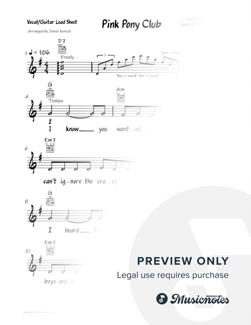 EZ Letter Note Head Lead Sheet Arrangement for Pink Pony Club instrumental cues and guitar chord diagrams in G major by Chappell Roan. Fun for all ages and levels.