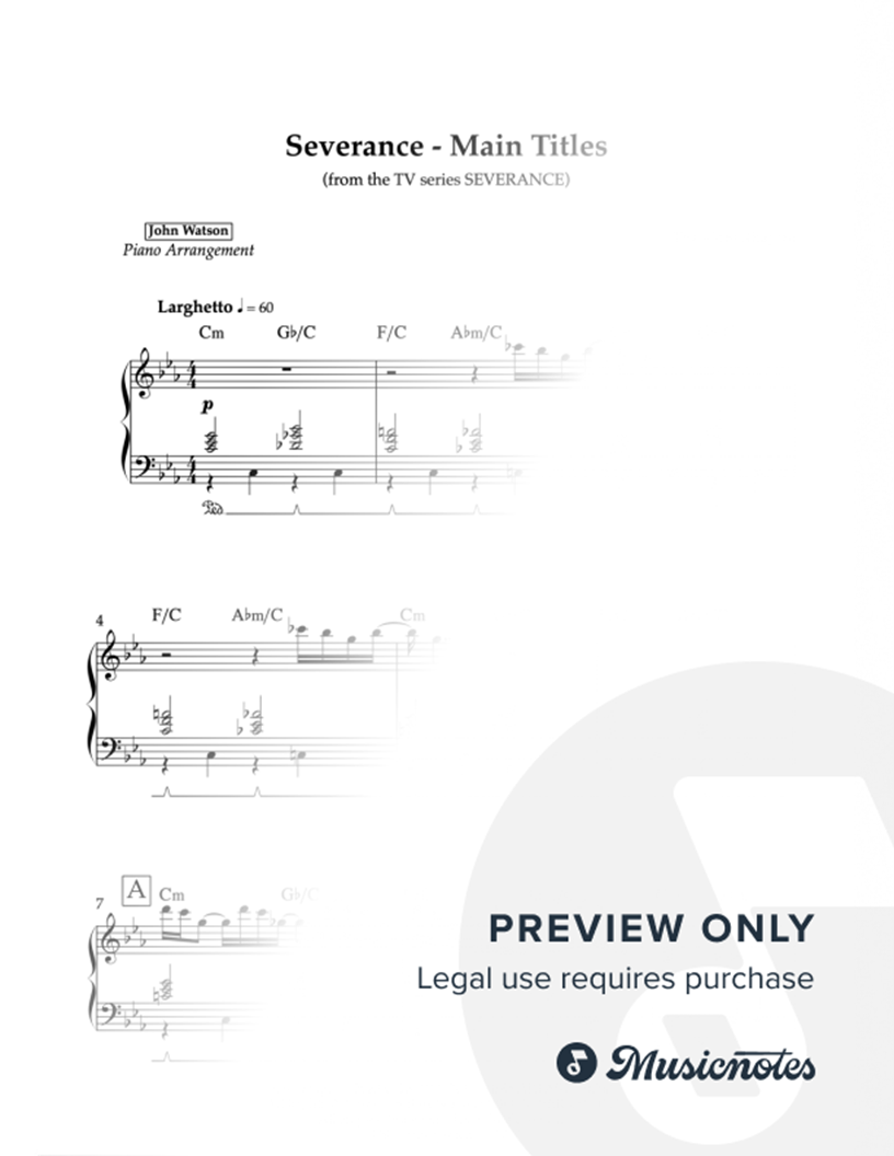 A dramatic arrangement of the haunting Main Titles theme from the TV series 'Severance'. The tempo marking is Larghetto (approximately 60 BPM).