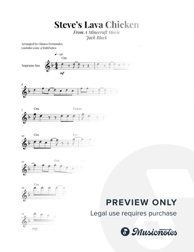 Sheet music for Steve's Lava Chicken - A Minecraft Movie arranged for Soprano Saxophone Solo. Professional layout. Clear notation. Perfect for performances. Purchase now!