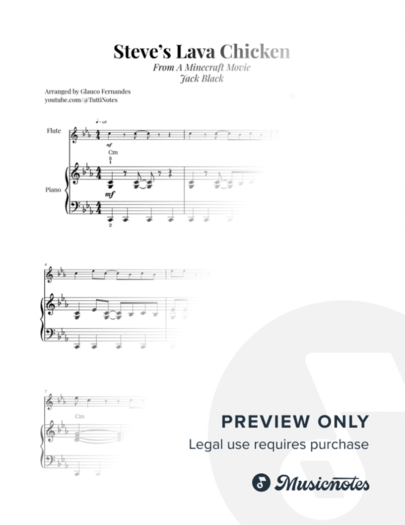 Sheet music for Steve's Lava Chicken - A Minecraft Movie arranged for Flute and Piano. Professional layout. Clear notation. Perfect for performances. Purchase now!